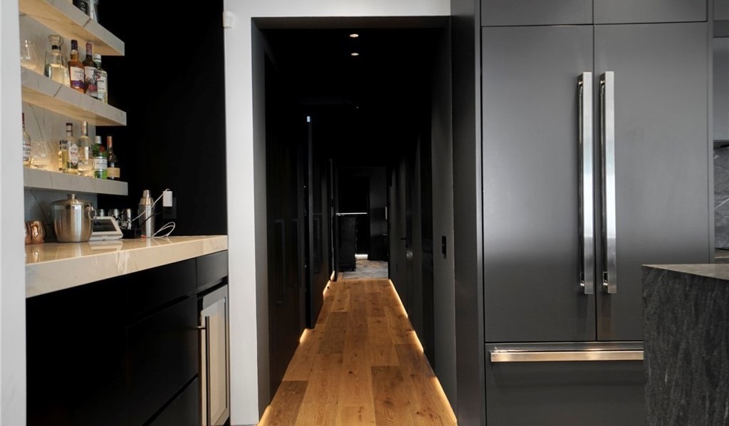 A striking modern galley kitchen featuring dramatic black cabinetry, light wood open shelving, and a clean quartz countertop, unified by warm hardwood flooring and sophisticated under-cabinet lighting that creates depth. The high-contrast palette and minimalist approach convey contemporary luxury with moody elegance.