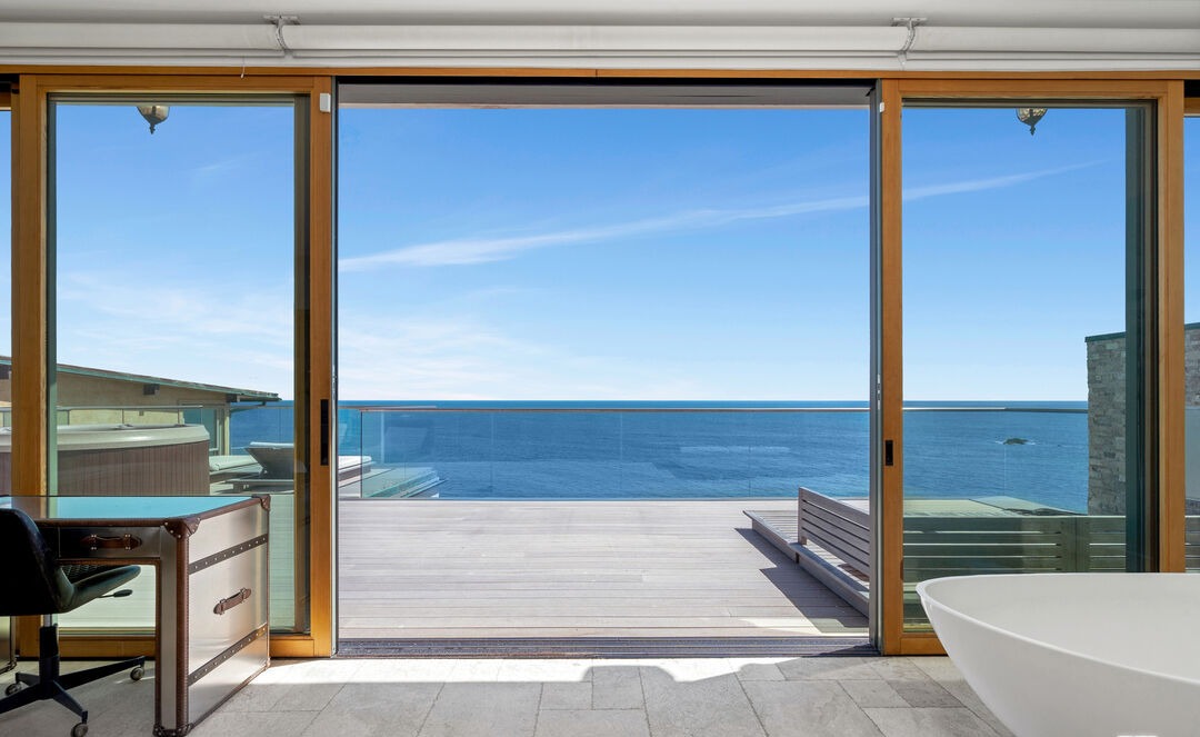 A stunning waterfront primary bedroom suite featuring expansive floor-to-ceiling windows framing unobstructed ocean views, seamlessly blending indoor and outdoor living. The serene spa-like bathroom showcases a sculptural freestanding soaker tub, natural stone flooring, and warm brass fixtures, with organic modern design elevated by abundant natural light and minimalist coastal aesthetic.