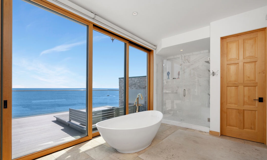 A stunning primary bathroom featuring a sculptural freestanding soaking tub positioned to command panoramic ocean views through expansive floor-to-ceiling glass doors, paired with a frameless walk-in shower and travertine stone flooring. The space exemplifies organic modern coastal luxury with warm natural wood frames, soft neutral tones, and abundant natural light that transforms the bathroom into a spa-like retreat with seamless indoor-outdoor flow.