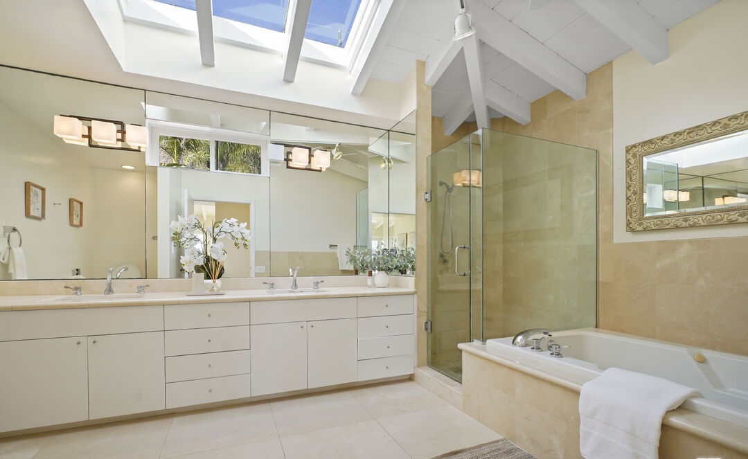 A luminous primary bathroom featuring a sophisticated double-vanity setup with marble countertops, cream cabinetry, and abundant natural light streaming through skylights and high clerestory windows. The generous layout seamlessly integrates a walk-in frameless glass shower enclosure and soaking tub, with warm-toned travertine accents and brushed chrome fixtures creating an airy yet luxurious retreat.