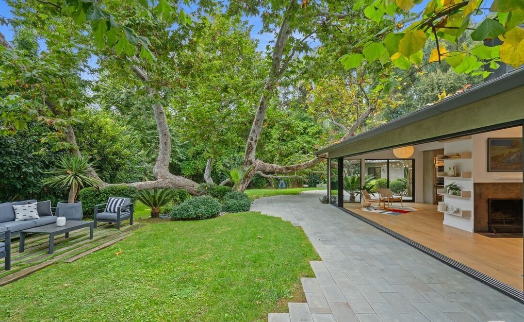 A stunning modern patio seamlessly integrated with the indoor living space, featuring mature specimen trees, a continuous stone paver floor, and expansive black-framed glass doors that dissolve the boundary between interior and exterior. The design showcases organic modernism through natural materials, abundant greenery, and warm wood tones paired with contemporary furnishings and a fireplace anchoring the sophisticated outdoor living area.