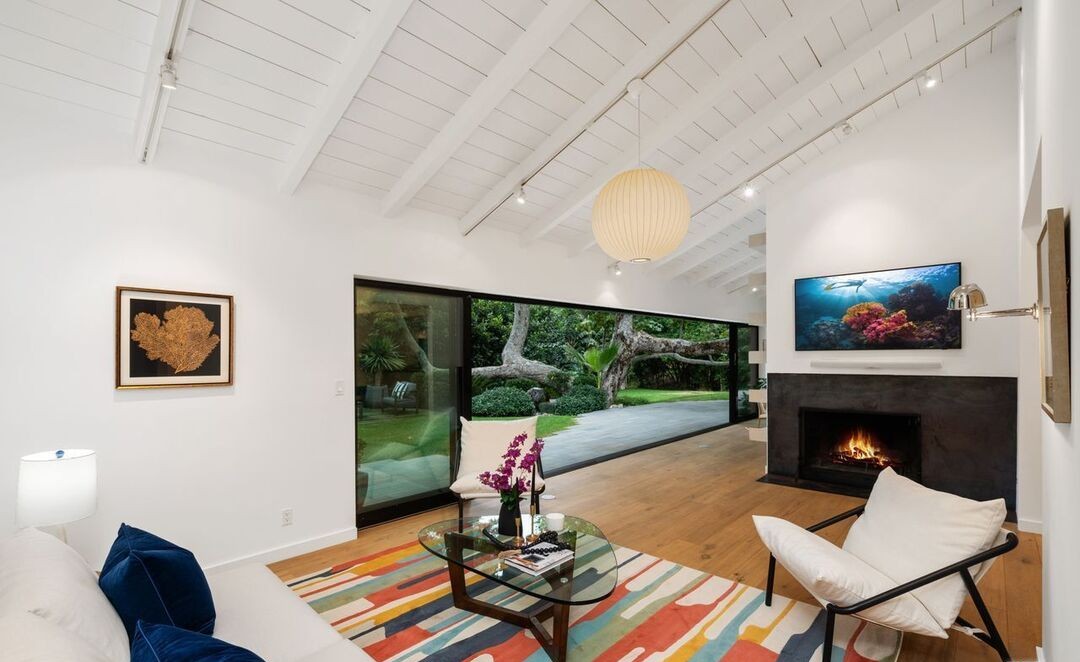 A sophisticated open-concept living room bathed in natural light through expansive floor-to-ceiling sliding glass doors overlooking a manicured garden and mature trees. The space balances warmth through natural wood ceiling beams and hardwood flooring with clean modern lines, featuring a striking black fireplace accent wall, minimalist mid-century-inspired furniture, and a carefully curated art collection that elevates the serene, understated luxury of the interior.