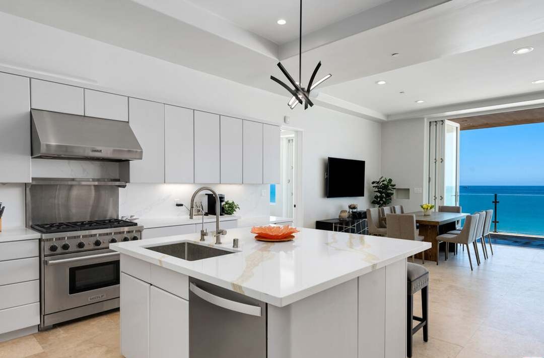 A stunning oceanfront kitchen exemplifying organic modern coastal design, featuring pristine white flat-panel cabinetry, luminous quartz waterfall island countertops, and professional stainless steel appliances, unified by abundant natural light flooding through floor-to-ceiling windows overlooking turquoise ocean vistas. The sophisticated coffered ceiling, minimalist subway tile backsplash, and carefully curated statement pendant lighting create an effortlessly luxurious yet serene culinary sanctuary seamlessly integrated with the adjoining ocean-view living spaces.