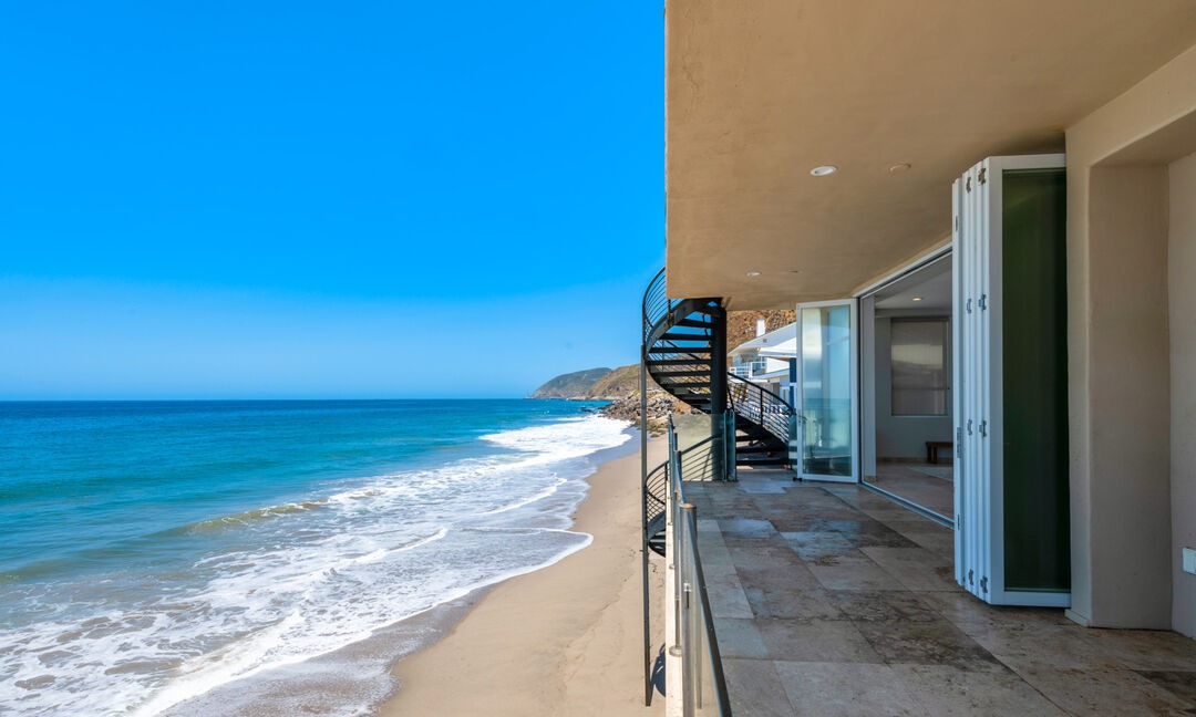 An expansive oceanfront patio featuring seamless indoor-outdoor integration with pristine coastal vistas, modern black spiral staircase access, and refined minimalist design with warm neutral and cool blue palettes. The space exemplifies high-end Southern California modern architecture with direct beach access and sophisticated material restraint.