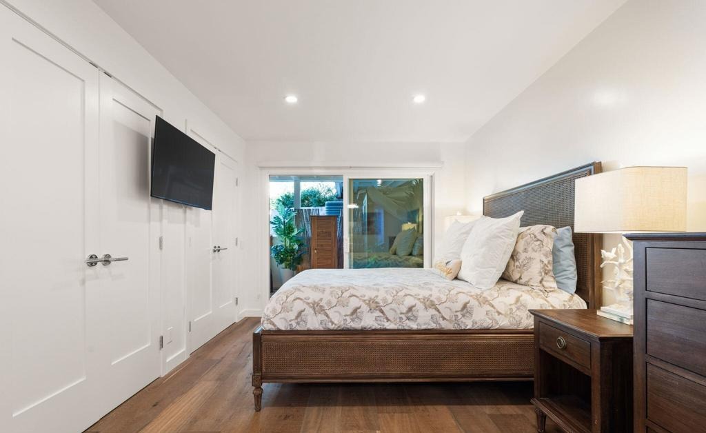 A serene primary bedroom featuring a walnut-frame bed with sophisticated neutral bedding, warm hardwood floors, and abundant natural light from expansive glass doors overlooking a tropical garden. Clean transitional design combines traditional millwork and crown molding with modern furnishings and a minimalist aesthetic, accented by brass lighting fixtures and soft blue-gray tones.