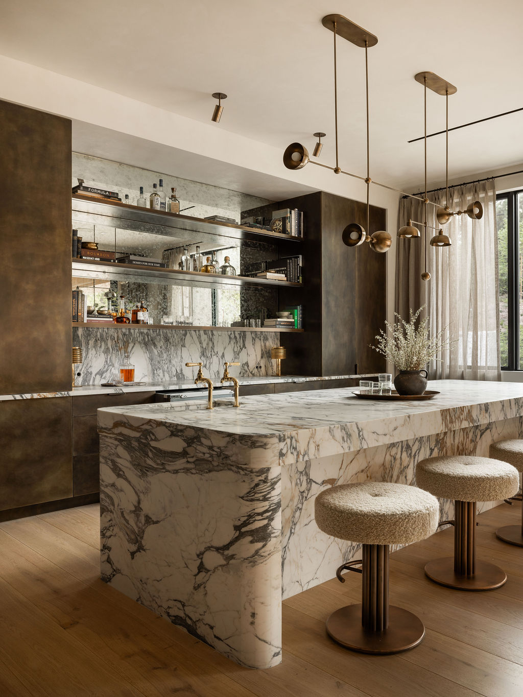 Waterfall IslandOpen ShelvingStatement LightingLarge Format Marble IslandCustom MillworkFloor To Ceiling WindowsCurved Island DesignMultiple Pendant LightsHigh Ceilings