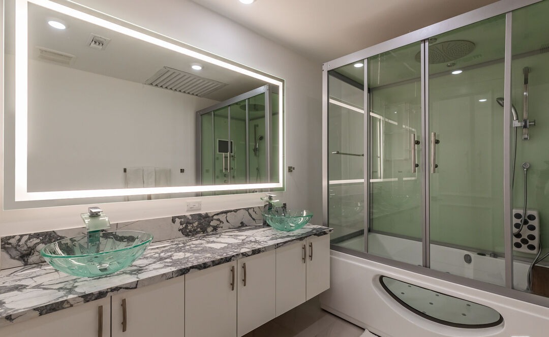 Double VanityFrameless Glass ShowerSoaking TubFloating VanityVessel SinkStatement LightingLighted MirrorRainfall Showerhead