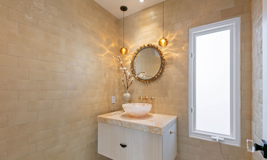 A sophisticated powder room featuring warm beige large-format tile walls, a floating white vanity with elegant marble countertop, and a creamy vessel sink. Ambient lighting from two brass pendant fixtures and a decorative sunburst mirror creates a luxurious, spa-like atmosphere enhanced by abundant natural light from the glass door.