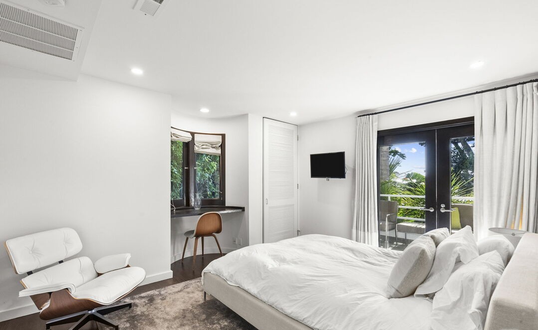 A sophisticated primary bedroom featuring floor-to-ceiling black-framed glass doors opening to manicured outdoor views, unified by a serene palette of whites, creams, and warm neutrals. The space combines organic modern comfort with transitional elegance, highlighted by a sculptural walnut lounge chair and minimalist desk nook, creating a spa-like sanctuary bathed in abundant natural light.