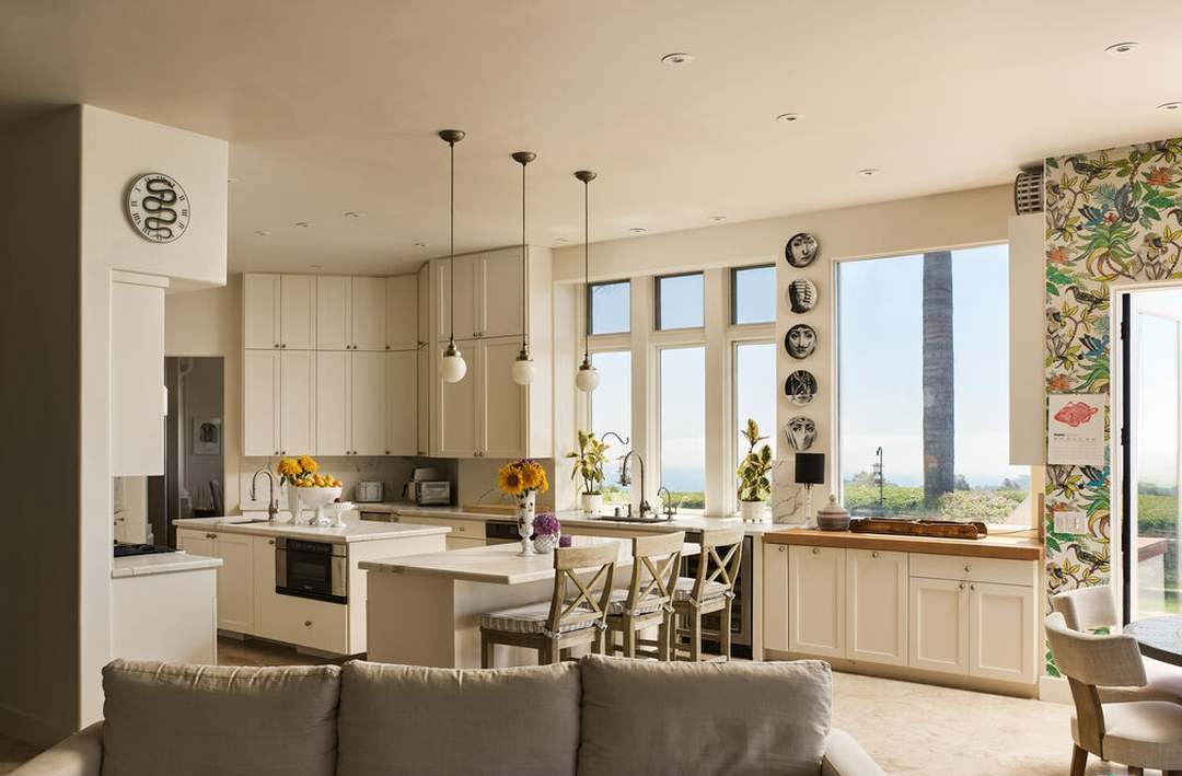 A sophisticated open-concept kitchen defined by cream-colored shaker cabinetry, quartz countertops, and abundant natural light from floor-to-ceiling windows overlooking a waterfront vista. The design seamlessly blends transitional elegance with Hamptons-inspired detailing, featuring brass pendant lighting, a waterfall-edge island, and carefully curated decorative elements that evoke coastal sophistication and understated luxury.