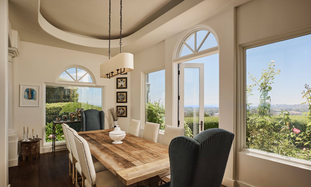 A sophisticated formal dining room with abundant natural light from floor-to-ceiling arched windows framing scenic valley views, anchored by a reclaimed-wood dining table and mixed upholstered seating in cream and black. The elegant tray ceiling, cream walls, hardwood flooring, and statement pendant lighting create an airy yet refined space that seamlessly blends transitional architecture with organic modern furnishings.