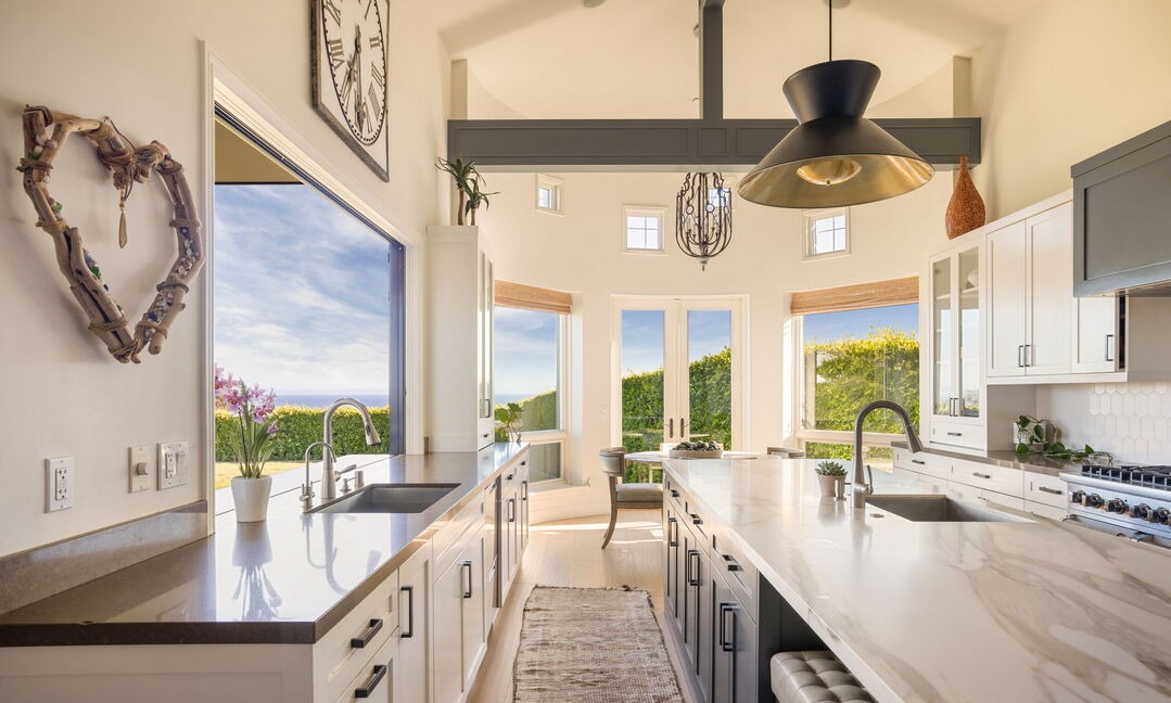 A stunning modern farmhouse kitchen featuring dual marble islands with waterfall edges, abundant natural light from expansive floor-to-ceiling windows, and sculptural black pendant lighting. The space seamlessly blends organic warmth (natural wood trim, soft cream walls) with contemporary luxury finishes (marble countertops, black hardware, skylights) creating an editorial-quality, light-filled culinary sanctuary with commanding views of manicured landscaping.