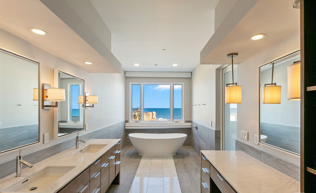 Double VanityFreestanding TubWalk In ShowerFloor To Ceiling WindowsStatement LightingWainscotingHigh CeilingsOcean View