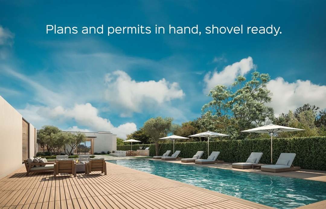 A stunning ultra-luxury resort-style pool area featuring a pristine turquoise lap pool with sophisticated wooden decking, contemporary lounge seating with neutral cushions, and elegant white shade umbrellas. The design seamlessly blends organic modern aesthetics with coastal influences, enhanced by manicured hedging, minimalist architecture, and a serene composition that evokes a high-end destination spa or luxury residential development.