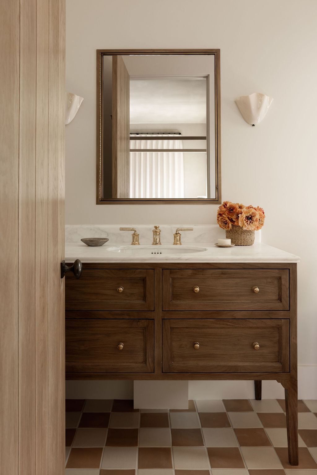A sophisticated bathroom featuring a furniture-style dark wood vanity with elegant raised-panel drawers paired with white marble countertop and brass fixtures. The warm cream walls, fan-shaped sconces, and distinctive checkered floor tile create an inviting, timeless aesthetic with organic modern sensibility.