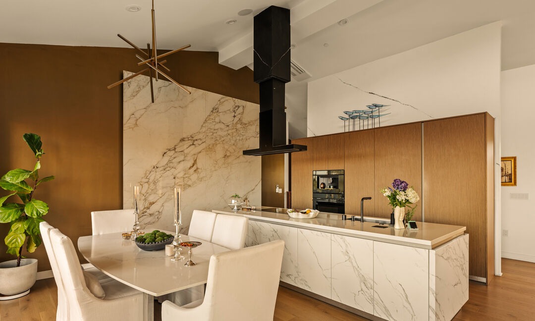 A sophisticated contemporary kitchen featuring a striking marble waterfall island, warm wood tone cabinetry paired with crisp white millwork, and dramatic bronze range hood against an open-concept living space. The design balances organic warmth with polished luxury through carefully curated material pairings and statement brass accents.