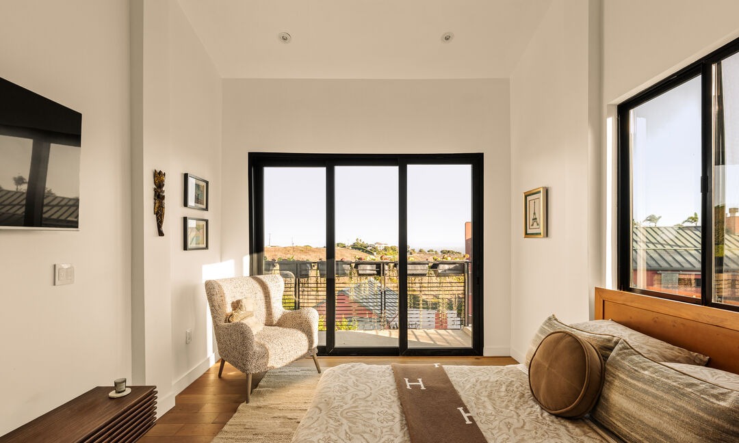 A serene primary bedroom featuring abundant natural light from floor-to-ceiling black-framed glass doors opening to a panoramic balcony overlooking rolling hills. Warm neutral tones, natural wood accents, and a custom walnut headboard create a sophisticated organic modern aesthetic with layered textures in cream linens, woven area rug, and curated wall art.