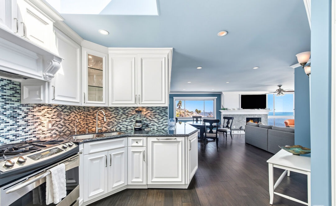 An elegant coastal-transitional kitchen featuring crisp white shaker cabinetry, a mosaic tile backsplash in blue and bronze tones, and granite countertops anchored by a large island with prep seating. Abundant natural light from skylights and expansive ocean-view windows creates an airy, sophisticated atmosphere that seamlessly flows into the living and dining areas.