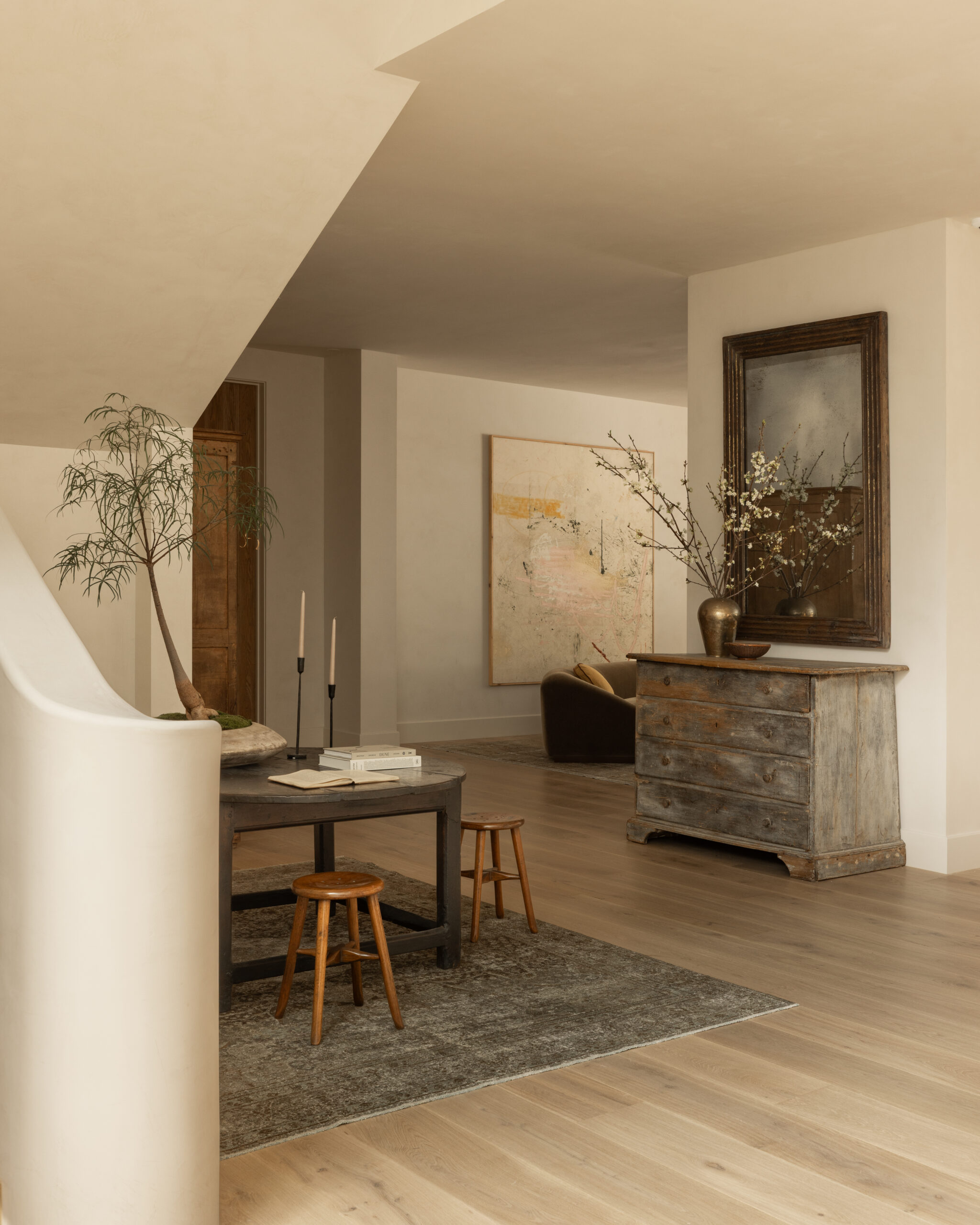 A luminous entryway showcasing dramatic vaulted ceilings with sculptural plaster arches, anchored by curated Asian-inspired antiques including a weathered wood chest and abstract artwork. The space masterfully balances organic modern architecture with wabi-sabi furnishings, creating an elevated yet serene first impression through warm neutral tones and minimal ornamentation.