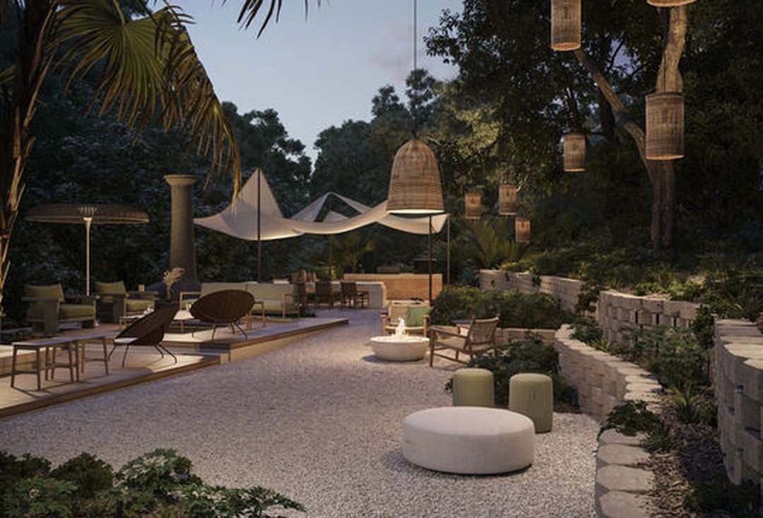 An exceptionally designed luxury outdoor patio featuring a sophisticated desert-modern aesthetic with warm neutral tones, organic furnishings, and thoughtfully composed landscape elements. The space balances minimalist principles with natural materials—gravel flooring, stone planters, linen upholstery, and hanging woven pendant lights—creating a serene, curated retreat that feels both contemporary and timeless.