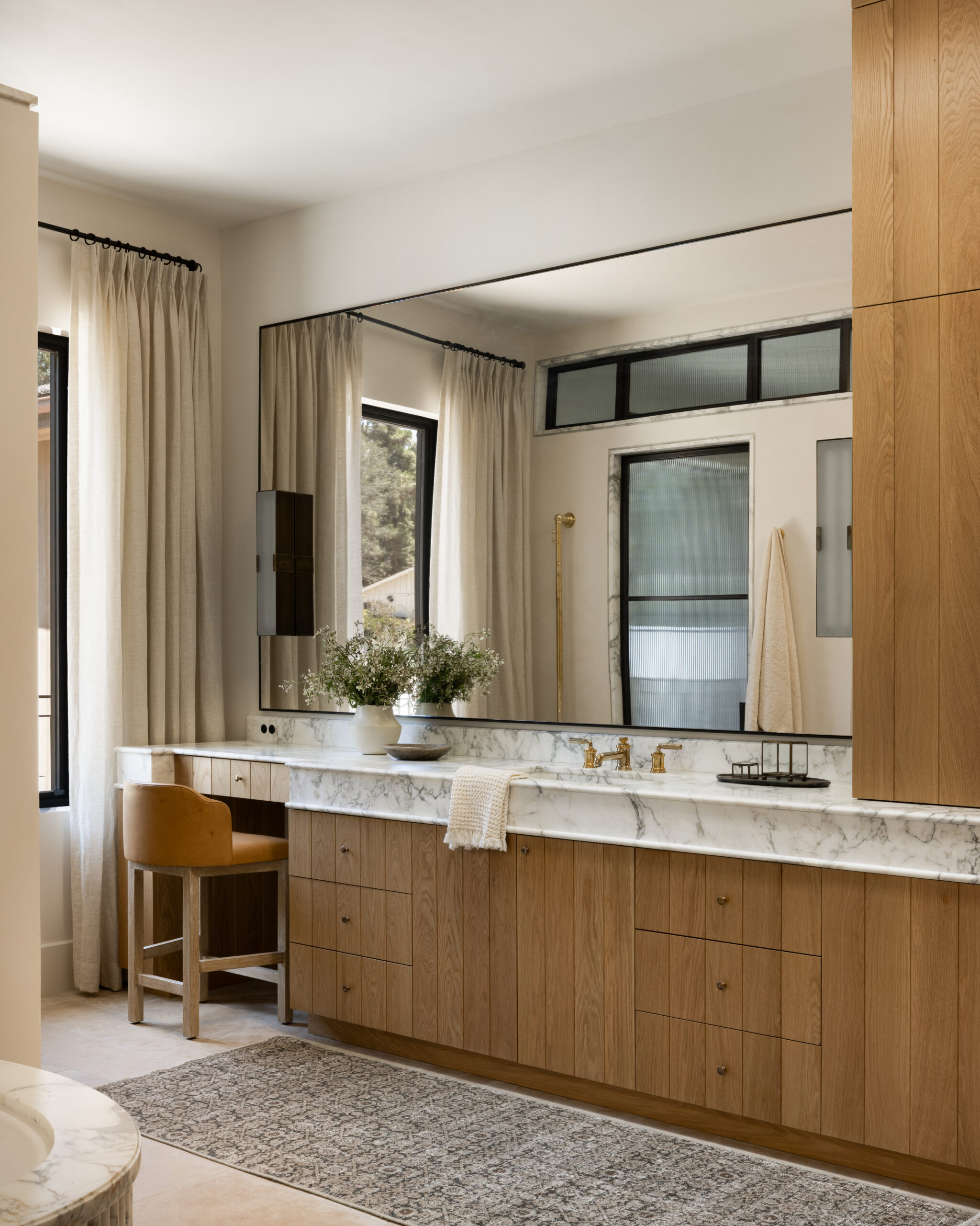 This sophisticated primary bathroom features a stunning double vanity with white marble waterfall countertops paired with natural oak cabinetry, complemented by black-framed windows and mirrors that create striking contrast. The space achieves serene luxury through its organic modern aesthetic, combining warm wood tones with brass fixtures, abundant natural light, and a dedicated makeup station that speaks to thoughtful custom design.