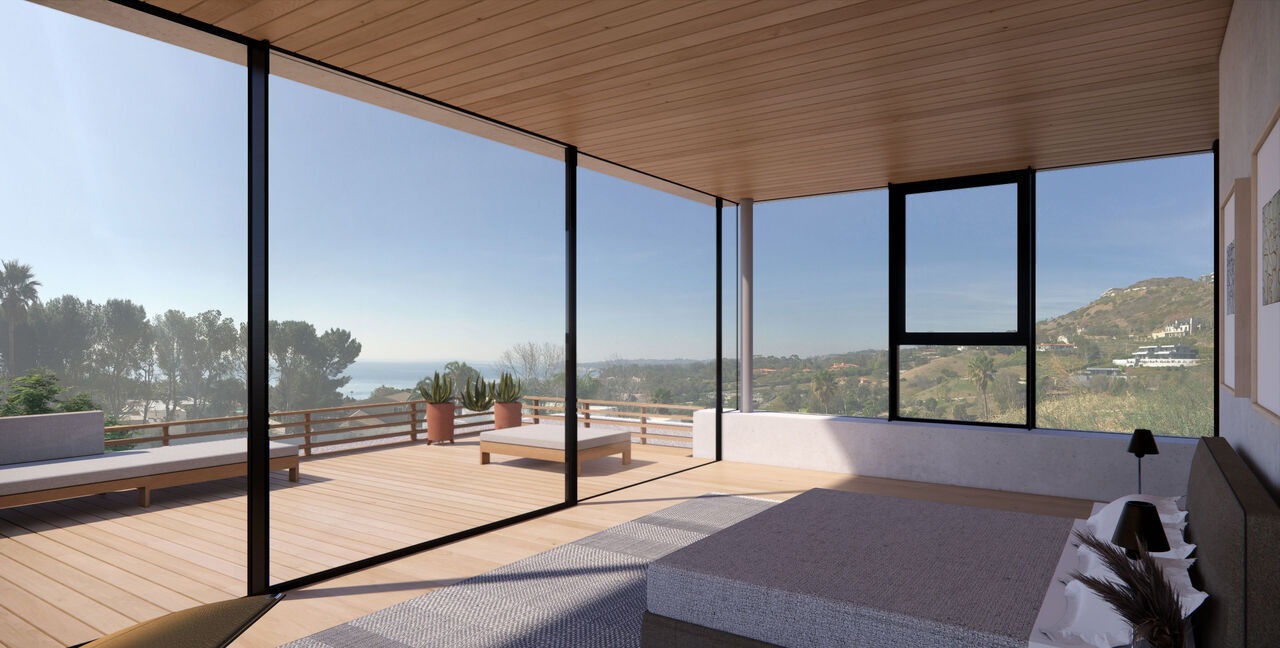 An ultra-luxury primary bedroom suite with expansive floor-to-ceiling windows framing sweeping hillside and coastal views, featuring a warm organic-modern aesthetic with light wood plank ceilings, natural fiber furnishings, and seamless indoor-outdoor flow via a spacious wooden deck. The design prioritizes natural light and panoramic landscape integration, with minimalist furnishings and a serene, sophisticated palette of warm neutrals and earth tones.