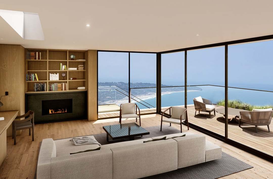 This ultra-luxury coastal living room features expansive floor-to-ceiling black-framed glass doors opening to a dramatic ocean-view terrace, with warm natural wood built-ins, a minimalist black fireplace, and a carefully curated mix of organic materials and neutral tones that epitomize contemporary coastal elegance. The soaring ceiling with skylight and seamless indoor-outdoor flow create a serene, light-filled sanctuary with commanding views of the Pacific coastline.