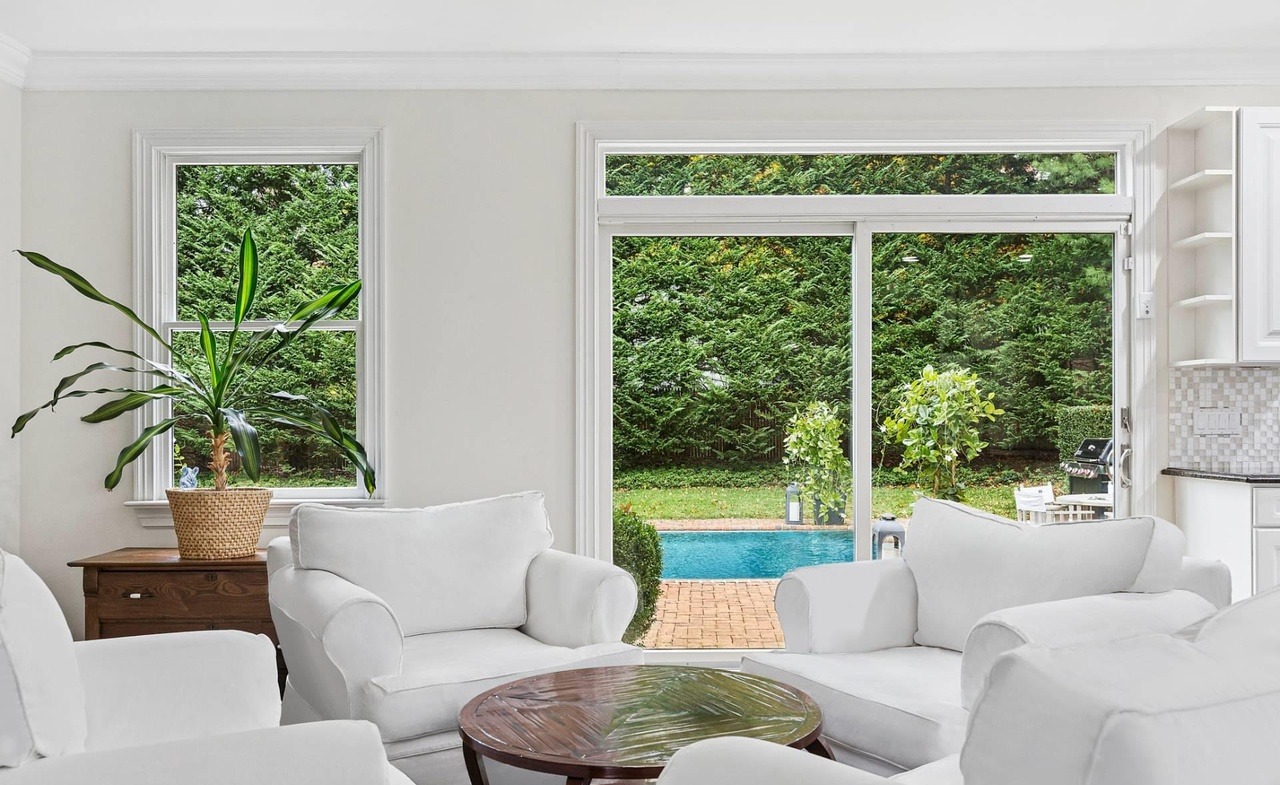 An elegantly refined living room featuring pristine white upholstered seating, a dark walnut coffee table, and abundant natural light streaming through floor-to-ceiling windows and glass doors that frame a resort-style pool and manicured grounds. The space exemplifies East Coast luxury with its classic white and neutral palette, traditional crown molding, and seamless indoor-outdoor flow.