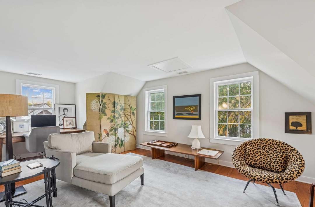 A sophisticated attic home office featuring vaulted ceilings, abundant natural light from multiple windows, and a harmonious blend of warm wood tones with cool whites and creams. The space masterfully combines traditional architectural details (crown molding, custom millwork) with contemporary furnishings and a striking leopard-print accent chair that adds personality and visual interest.