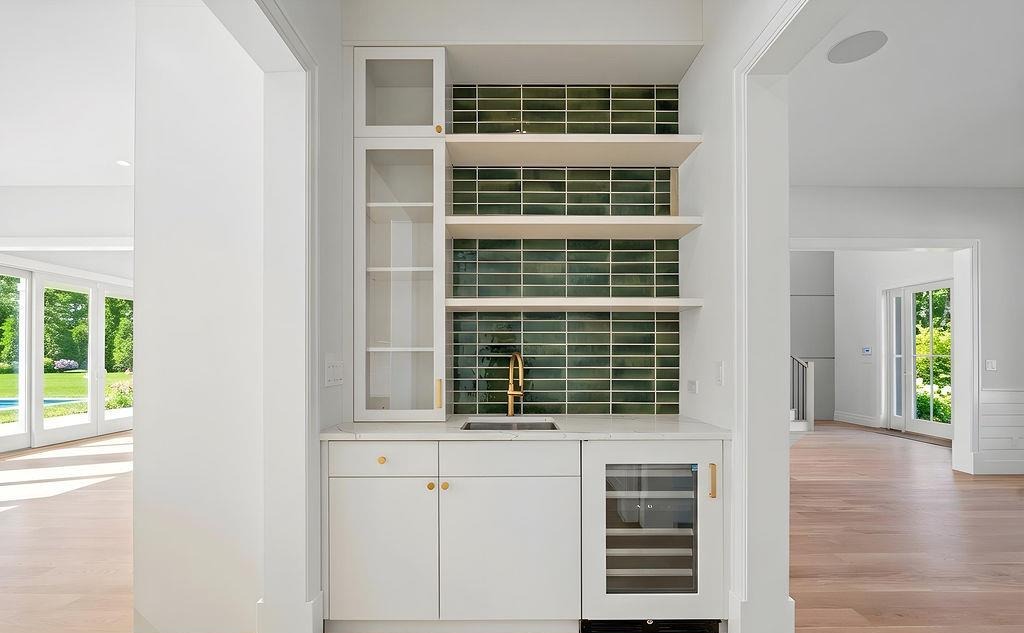 A sophisticated transitional kitchen featuring crisp white cabinetry with brass hardware, complemented by striking dark green subway tile backsplash and open shelving with warm wood accents. The space seamlessly integrates into a light-filled open-concept home with abundant natural light, warm hardwood flooring, and a curated balance of contemporary simplicity and organic warmth.