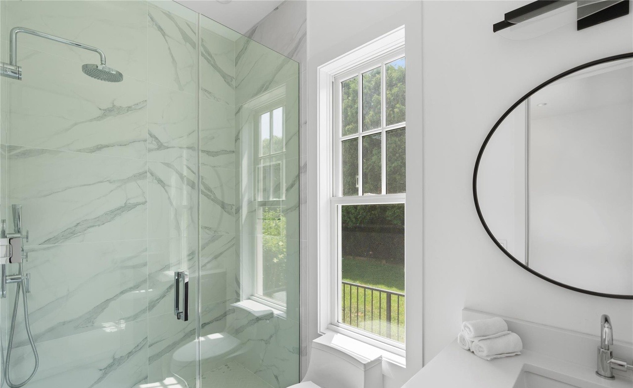 A serene primary bathroom featuring a frameless glass walk-in shower with marble-veined tile surround, paired with a sleek floating vanity and an arched black-framed mirror. Abundant natural light from floor-to-ceiling windows overlooking green landscape elevates the spa-like aesthetic, while modern chrome fixtures and clean lines balance traditional architectural details like crown molding.