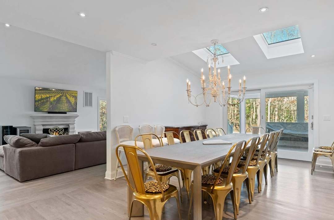 A stunning open-concept family room and dining area bathed in natural light from multiple skylights and floor-to-ceiling windows, featuring a sophisticated blend of transitional and organic modern design. The space showcases a light-filled palette of whites and creams with warm hardwood flooring, accented by a striking brass chandelier, golden-toned dining chairs, and a neutral upholstered sectional, creating an airy yet deeply luxurious atmosphere with impeccable detailing and bespoke furnishings.
