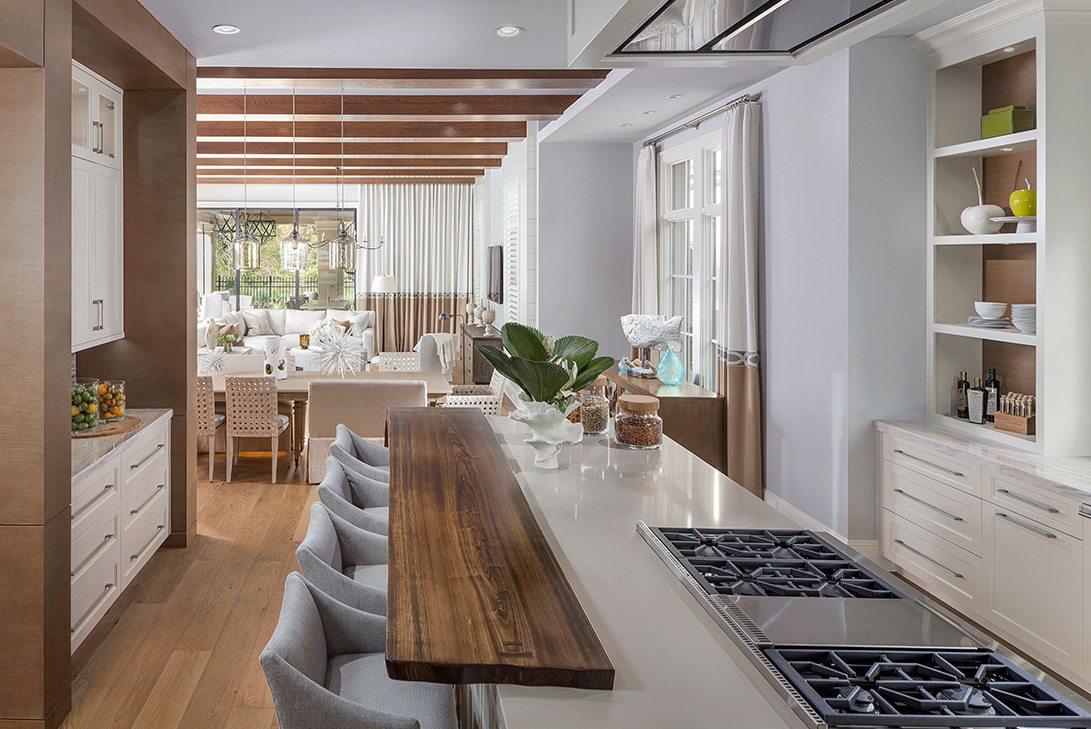 An open-concept luxury kitchen featuring a striking two-tone design with white custom cabinetry paired against warm natural wood accents, anchored by a dramatic walnut waterfall island with quartz countertops. The space exudes refined elegance through coffered ceilings, abundant natural light, professional-grade dual cooktops, custom built-in shelving, and sophisticated material layering that balances modern functionality with warm, organic textures.