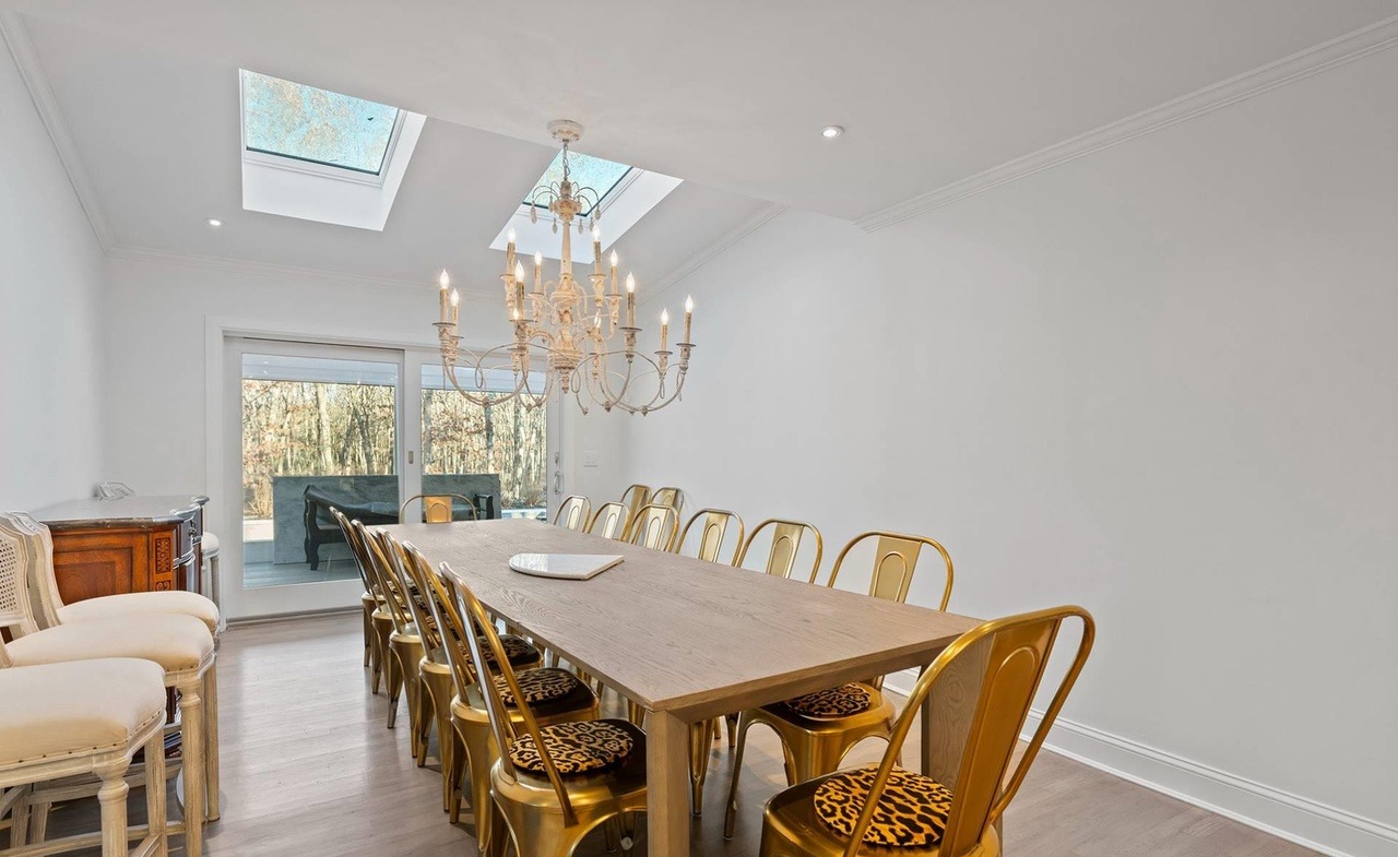 A luminous transitional dining room featuring a natural wood table paired with elegant gold metal chairs with patterned black upholstered seats, anchored by a statement brass chandelier hanging beneath dual skylights. The sophisticated space balances formal elegance with modern airiness through abundant natural light, clean white walls, hardwood flooring, and refined crown molding details.