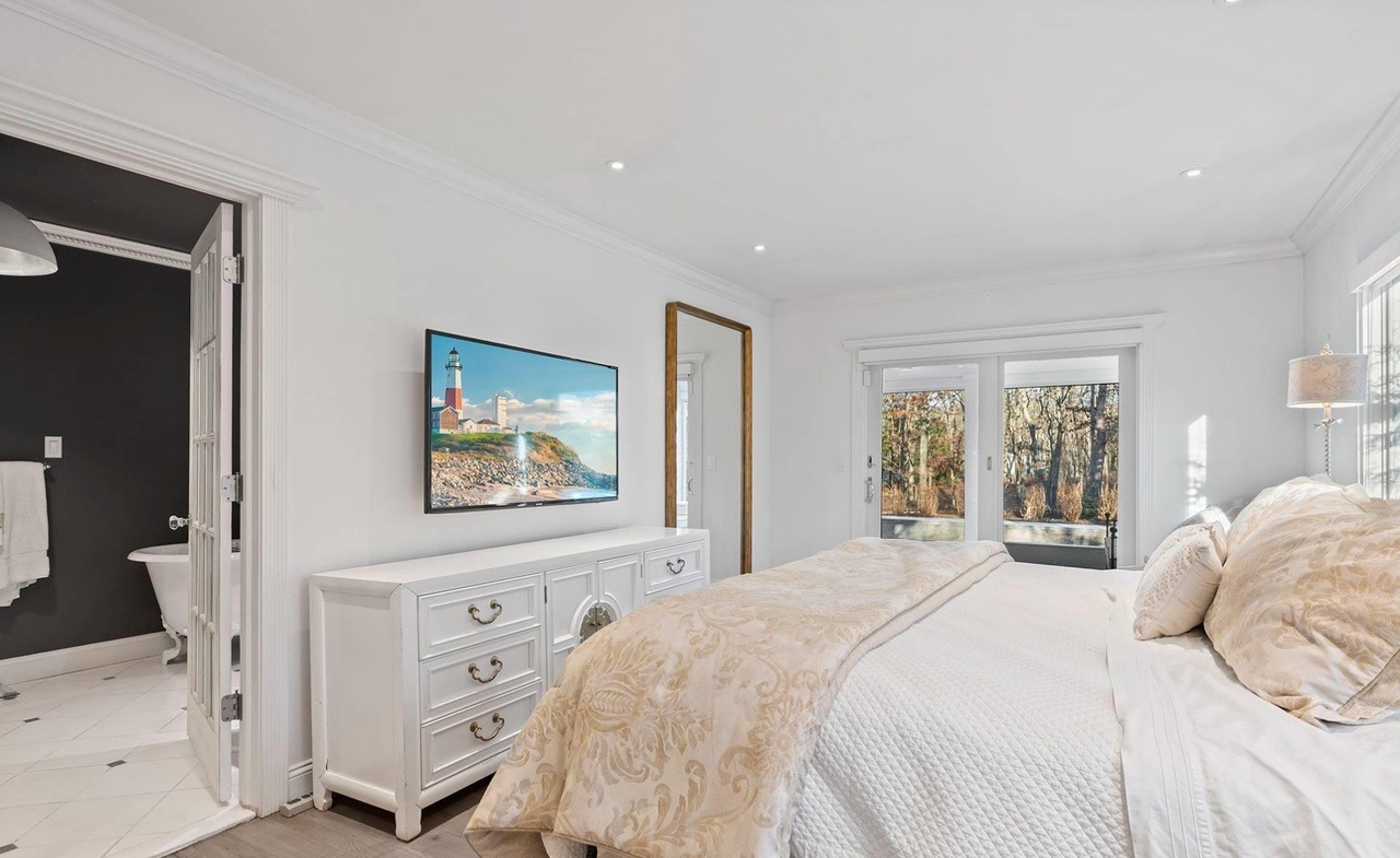 A serene primary bedroom suite featuring pristine white cabinetry with brass hardware, abundant natural light from French doors, and a sophisticated neutral palette enhanced by warm cream and gold accents. The space exemplifies transitional luxury design with traditional architectural details like crown molding paired with clean modern furnishings and a calm, resort-like atmosphere.