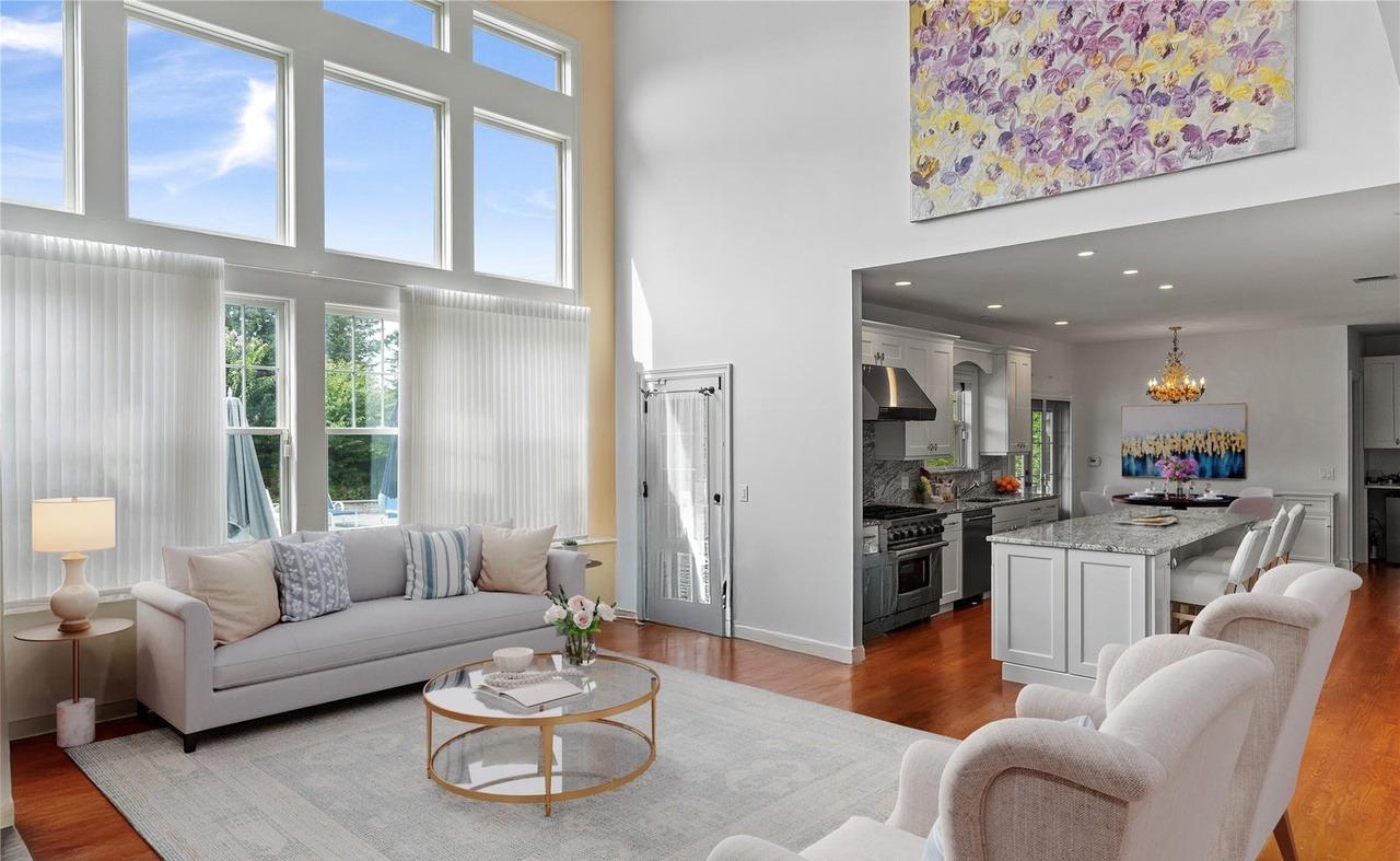 A stunning open-concept living and kitchen space flooded with natural light through floor-to-ceiling windows, featuring elegant transitional design with white cabinetry, granite countertops, and soft neutral furnishings accented by gold and blue tones. The high ceilings, crown molding, and carefully curated artwork create a sophisticated yet inviting atmosphere that blends traditional architectural details with contemporary comfort.