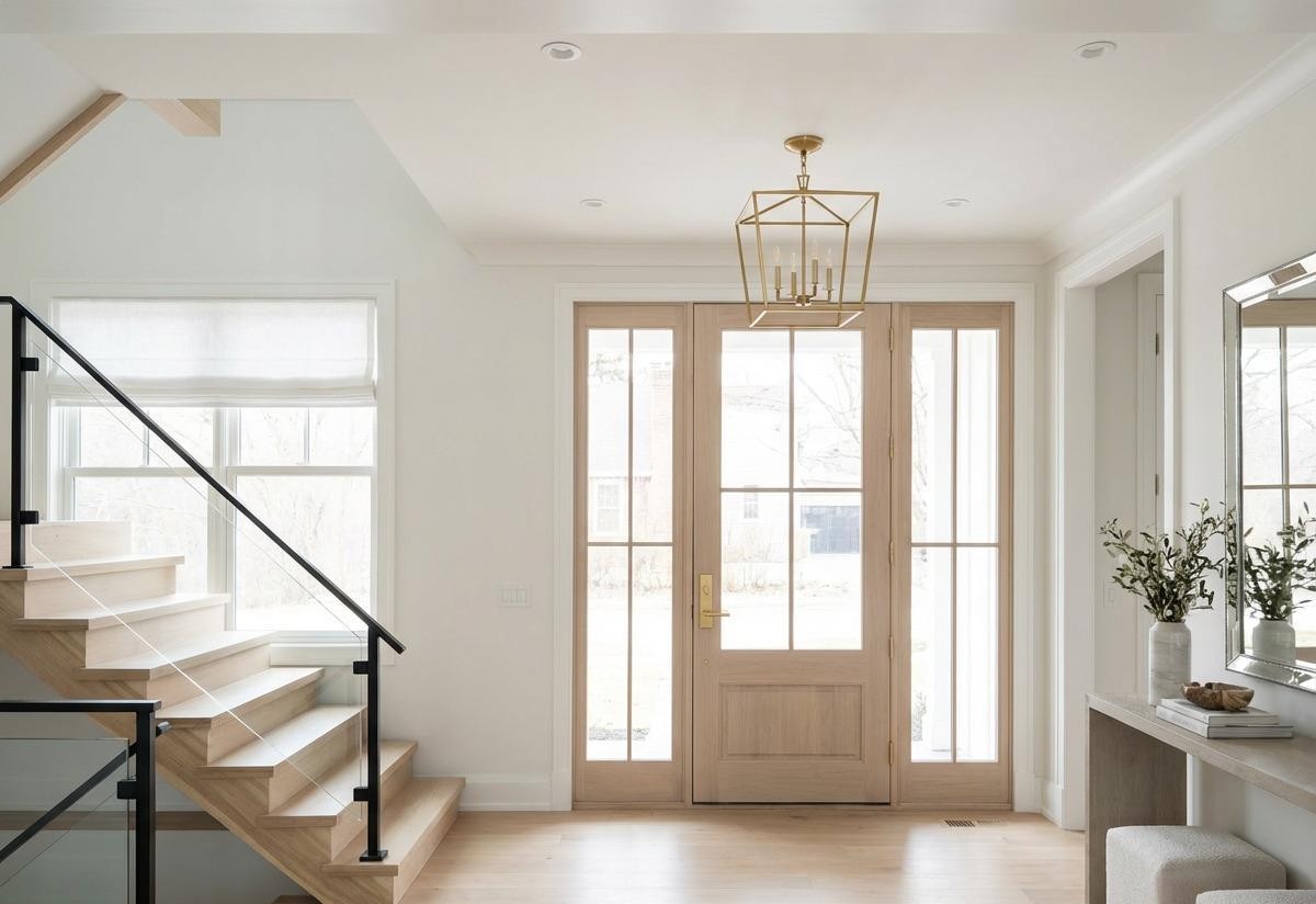 A bright, airy transitional entryway featuring a contemporary geometric brass chandelier, light oak wood floors, and clean white walls punctuated by abundant natural light from floor-to-ceiling windows and French doors. The space seamlessly blends traditional architectural details like crown molding with modern furnishings and a minimalist aesthetic, creating an elegant, welcoming foyer with a sophisticated yet warm atmosphere.