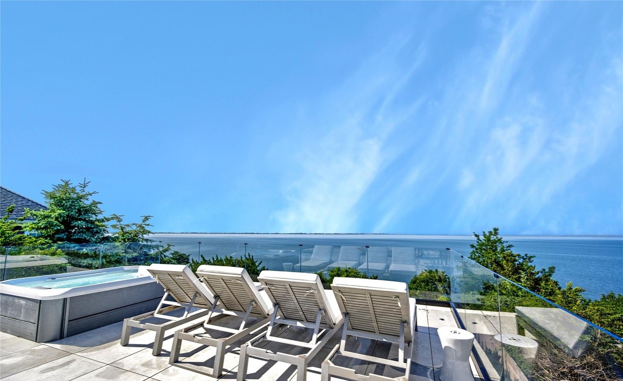 A spectacular clifftop patio with sweeping ocean views, featuring contemporary lounge seating and integrated hot tub set against a seamless glass railing that maximizes the coastal vista. The minimalist design with white furnishings, natural wood accents, and concrete decking creates a serene, sophisticated retreat that blurs the boundary between indoor and outdoor luxury living.