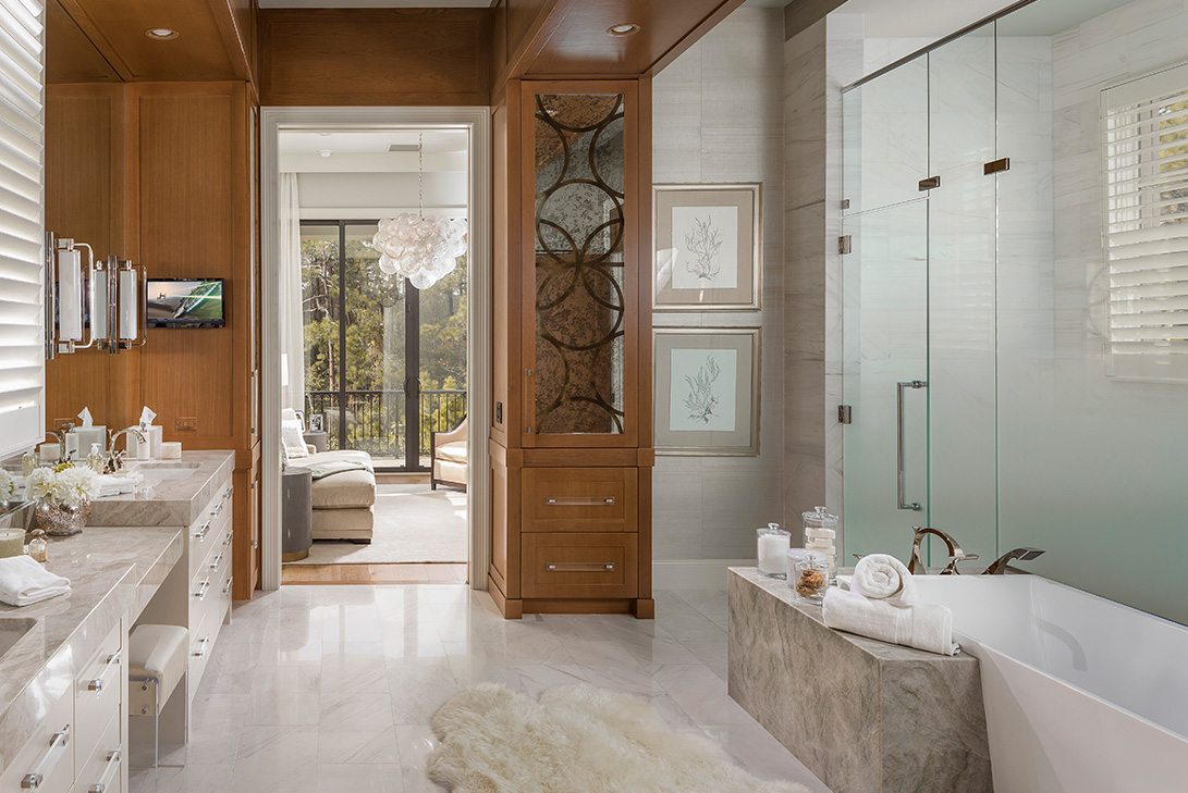 A sophisticated primary bathroom featuring rich wood paneling and custom millwork paired with pristine white marble surfaces and brass fixtures. The spa-like space flows seamlessly into an adjacent sitting area through a framed doorway, combining traditional architectural detailing with contemporary luxury materials.