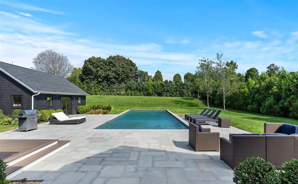 An expansive ultra-luxury poolside retreat featuring a pristine linear lap pool set within a meticulously designed stone paver terrace that seamlessly transitions between lounge areas, an outdoor kitchen pavilion, and manicured landscape grounds. The composition balances sophisticated modern minimalism with warm natural materials and organic landscaping, creating an elevated resort-like residential oasis.