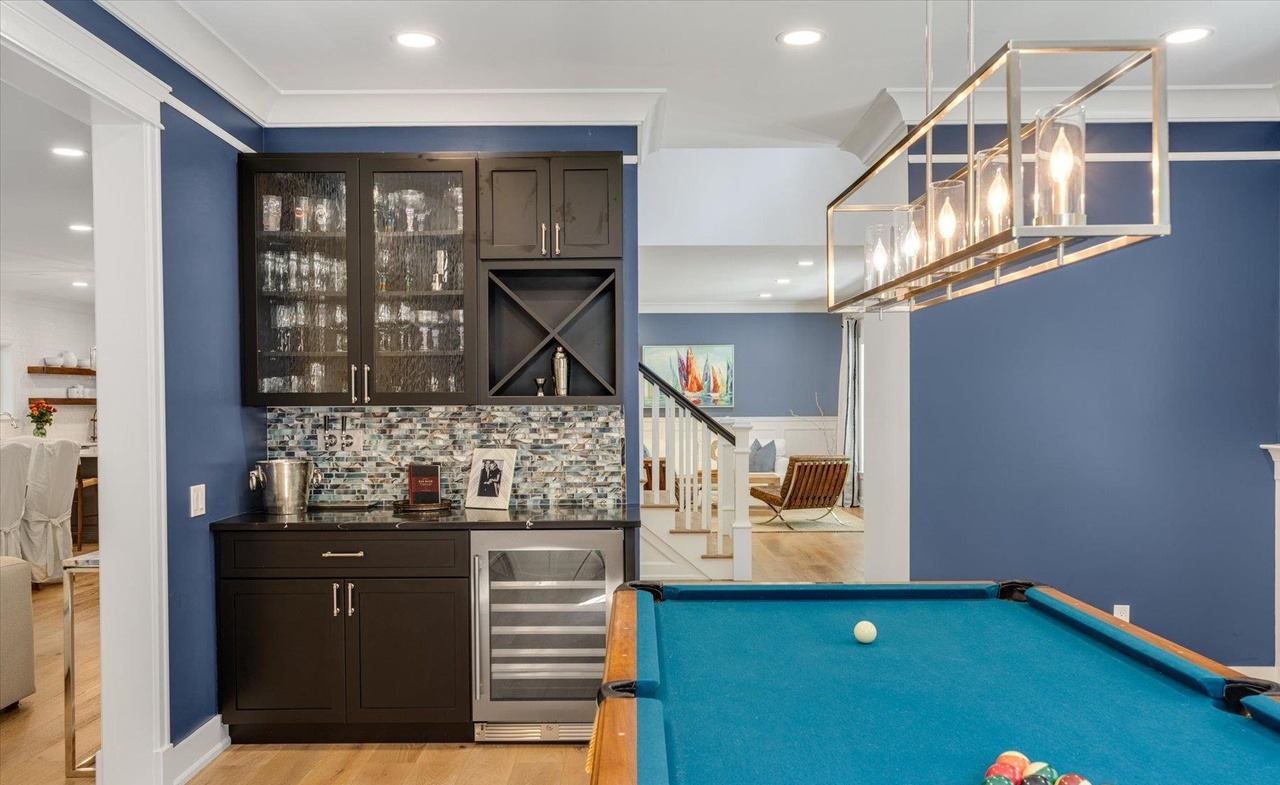 This sophisticated game room features a striking navy accent wall paired with black cabinetry, a built-in wet bar with mosaic backsplash, and a striking brass linear pendant light that bridges to an open-concept living area visible through glass doors. The space seamlessly combines entertaining functionality with luxury finishes, anchored by a professional turquoise pool table and complemented by elegant crown molding and hardwood flooring throughout.