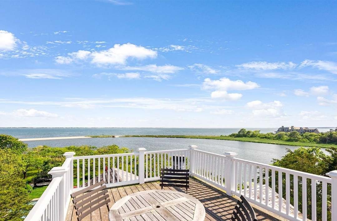 An elevated waterfront deck with classic Hamptons-style white railings and composite decking, offering panoramic views of a bay or sound with manicured grounds and distant shoreline architecture. The serene, airy composition features thoughtfully arranged outdoor seating that exemplifies sophisticated coastal luxury living with timeless elegance.