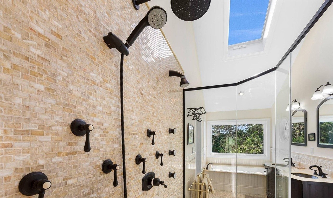 Walk In ShowerRainfall ShowerheadDual ShowerheadBody JetsSoaking TubFrameless Glass EnclosureSkylightFloating VanityHigh CeilingsFreestanding TubLarge Format Windows