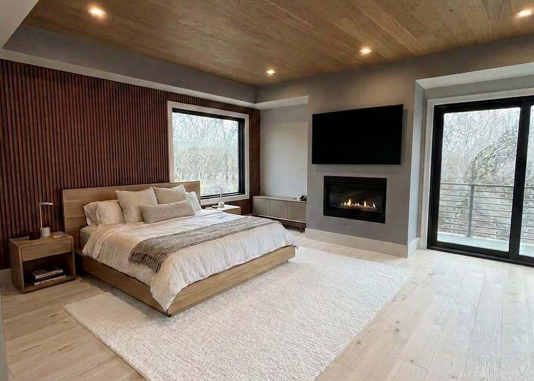 A sophisticated primary bedroom suite featuring a warm wood-plank ceiling, gas fireplace with integrated entertainment area, and abundant natural light from floor-to-ceiling windows with metal railings. The organic modern design combines natural wood furnishings with cream and warm gray tones, creating a serene yet luxurious sanctuary with seamless indoor-outdoor connection.