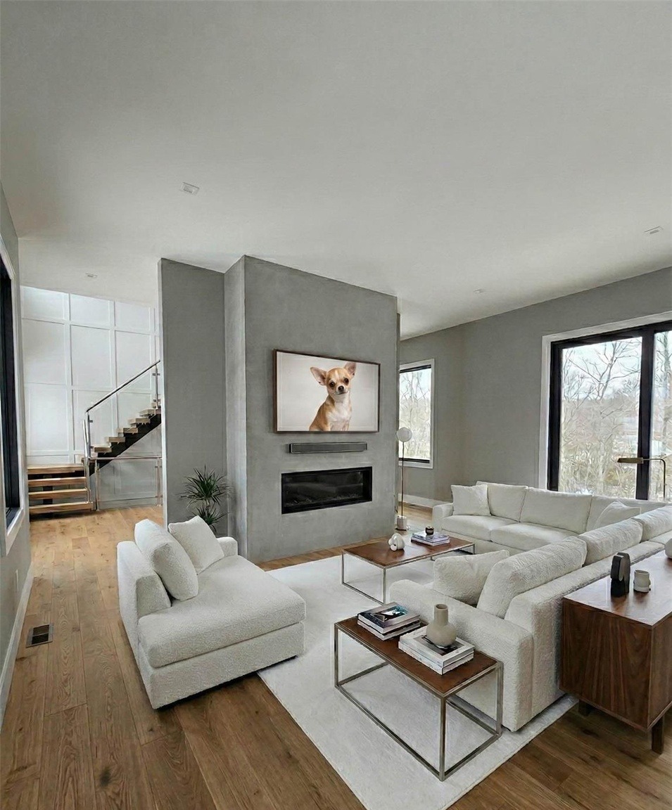 A sophisticated open-concept living room anchored by a textured concrete accent wall with an integrated linear fireplace and Chihuahua artwork, featuring a curated arrangement of cream-toned upholstered seating, warm wood side tables, and abundant natural light from floor-to-ceiling windows. The design balances contemporary minimalism with organic warmth through natural materials and a refined neutral palette.