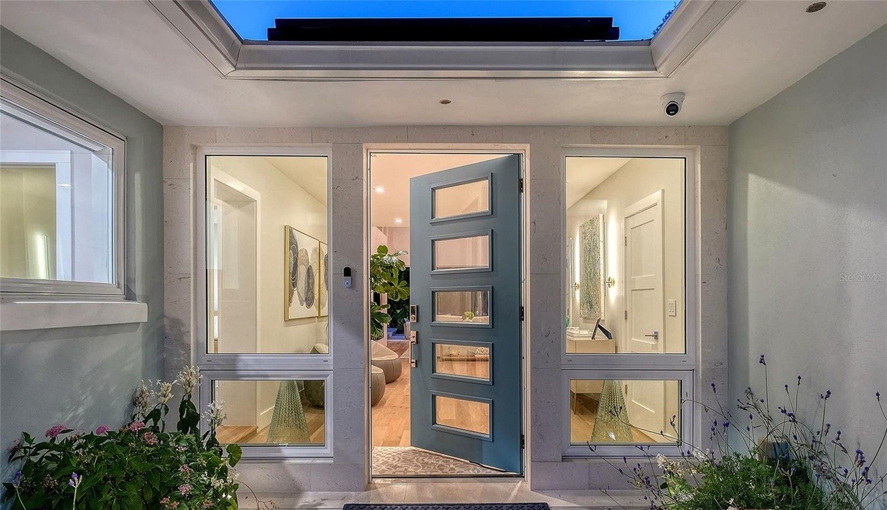 A sophisticated modern entryway featuring a prominent dark gray five-panel glazed door as the focal point, framed by expansive glass windows and doors that flood the space with natural light through an overhead skylight. Clean concrete flooring, minimalist white walls, and restrained plantings create an airy, serene introduction to the home with refined contemporary elegance.