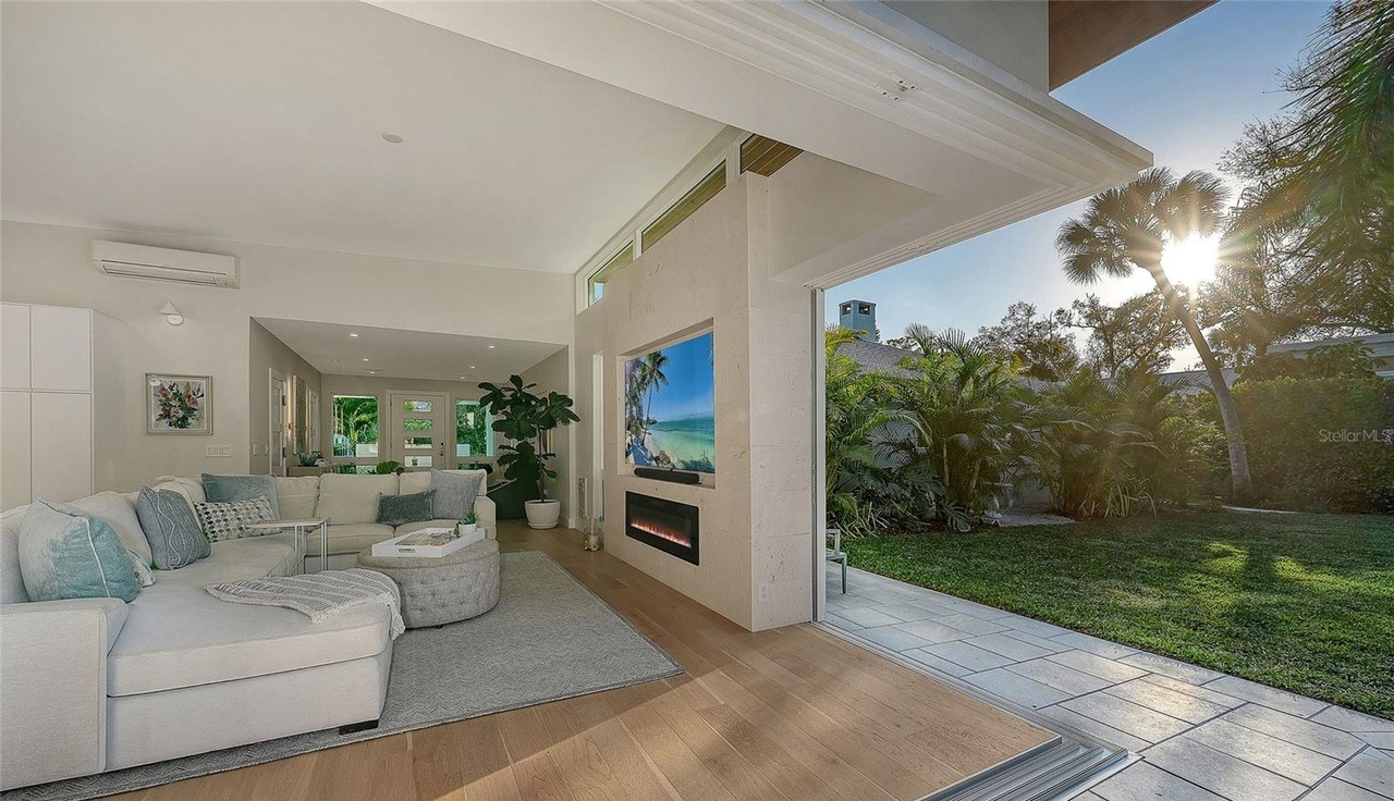 An airy, light-filled living room featuring a sophisticated coastal aesthetic with clean lines, neutral palette, and seamless indoor-outdoor connection through expansive glass walls overlooking lush landscaping. The space combines organic materials—natural hardwood flooring and soft linen furnishings—with modern minimalist design, accented by a linear fireplace and abundant natural light from skylights and sliding doors.