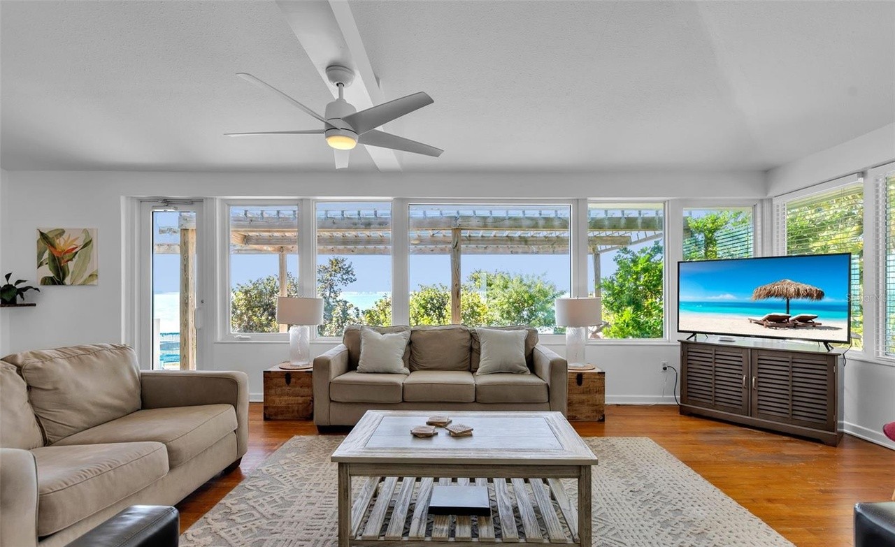A sophisticated coastal-inspired living room with abundant natural light from expansive floor-to-ceiling windows overlooking water and greenery, featuring warm hardwood flooring, cream upholstered furnishings, and natural wood accents that create an airy yet grounded aesthetic. The space seamlessly blends transitional architectural details like crown molding with organic modern furnishings and a contemporary ceiling fan, embodying effortless luxury.