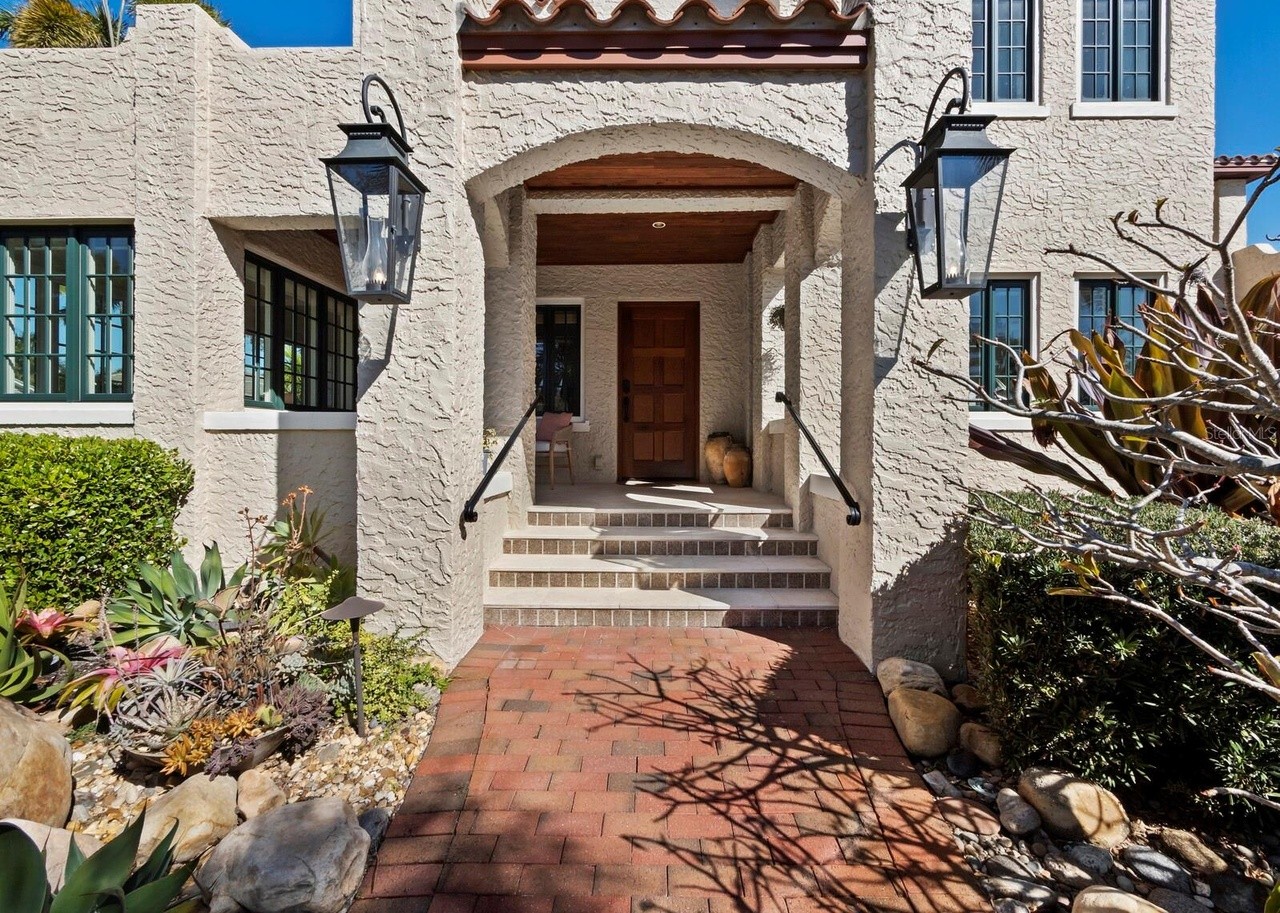 A stunning Spanish Colonial entryway featuring a graceful arched portico with textured cream plaster walls, terra cotta tile flooring, and wrought iron lantern sconces. The space exudes warm elegance with its traditional architectural details, native plantings, and inviting threshold framed by rustic wooden doors and period-appropriate hardware.