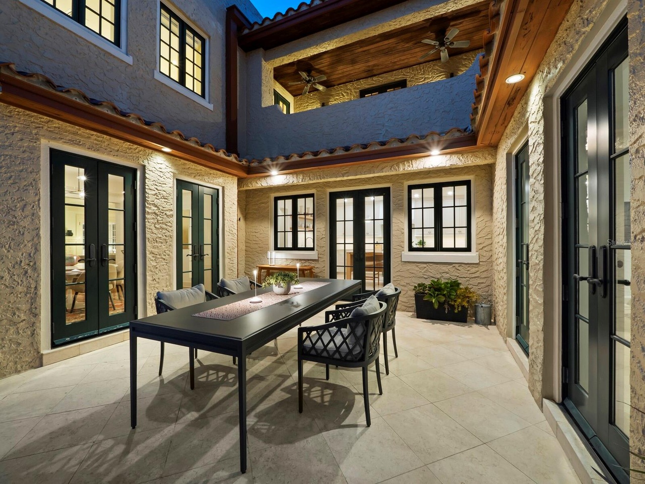 A sophisticated covered courtyard patio featuring warm-toned stone walls, exposed timber ceiling beams, and a sleek concrete dining table with black metal framing, creating an elegant indoor-outdoor living space. The abundant natural light from skylights and multiple French doors, combined with refined material choices and restrained furnishings, establishes a serene yet upscale Mediterranean-influenced retreat.